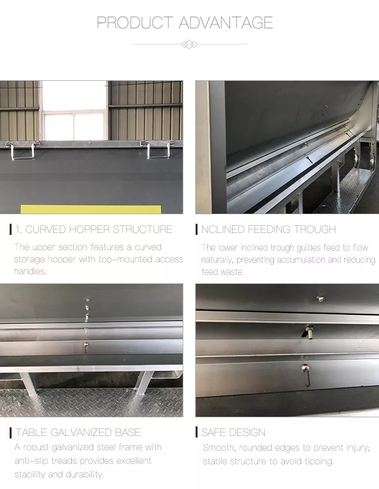 1. Қисық бункер құрылымы: үстіңгі бөлікте оңай толтыруға және техникалық қызмет көрсетуге мүмкіндік беретін, үстіңгі жағына орнатылған кіру тұтқалары бар иілген сақтау ыдысы бар.